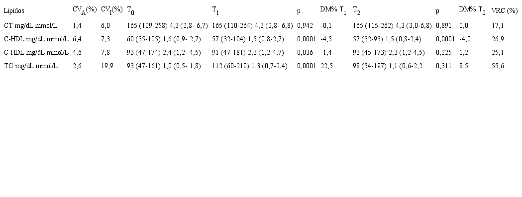 CVA:coeficiente de variación analítico; CVI: coeficiente de variabilidad biológica; T0: valor del analito en estado basal, luego de 12 horas de ayuno; T1: valor del analito 1 h después del desayuno; T2: valor del analito 1 h después del almuerzo; p: valor estadístico para datos pareados en la prueba t Student; DM%T1: diferencia media porcentual 1 h después del desayuno; DM%T2: diferencia media porcentual 1 h después del almuerzo. VRC: valor de referencia del cambio; CT: colesterol total; C-HDL: colesterol transportado por lipoproteínas de alta densidad; C-LDL: colesterol transportado por lipoproteínas de baja densidad; TG: triglicéridos.