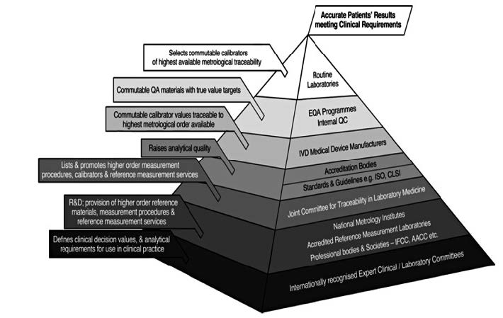 In the healthcare sector, good clinical practice relies on interchangeability of medical test results worldwide. Consequently, laboratory and clinical professional societies, guideline developers and regulators strive for medical test result equivalence based on traceability hierarchies to standards and methods of higher order and to SI-units when feasible, for the sake of safe and clinically effective patient care. As an answer to the publication of the European IVD Directive (IVDD) 98/79/ EC on in vitro medical devices the Joint Committee on Traceability in Laboratory Medicine (JCTLM) was established in 2002 through a Declaration of Cooperation between the International Bureau of Weights and Measures (BIPM), the International Federation for Clinical Chemistry and Laboratory Medicine (IFCC), and the International Laboratory Accreditation Cooperation (ILAC). The Declaration of Cooperation was revised in 2012, following the revision of harmonized standards relating to higher order reference materials and methods, and re-signed in April 2016. JCTLM’s goals are to provide a worldwide platform to promote and give guidance on internationally recognized and accepted equivalence of measurements in Laboratory Medicine and traceability to appropriate measurement standards. As the IVDD demands traceability of results of calibrators and controls to higher order reference materials and methods, JCTLM responded to these needs by establishing lists of suitable higher-order reference materials, higher-order reference measurement procedures and reference measurement services for laboratory medicine. With the creation of the JCTLM a framework has been established which can be used for the international recognition of such materials, procedures and measurement services from laboratories. To that end, the JCTLM framework laid down a process whereby reference materials, reference measurement procedures and reference measurement services are examined with respect to conformity with appropriate international documentary ISO-standards. The output is the JCTLM database of available higher-order reference materials and higher-order reference measurement procedures as well as reference measurement services provided by calibration laboratories (formerly named reference laboratories) that can be used by downstream users such as the IVD-industry and EQAS-organizers to meet and evaluate traceability requirements for in vitro diagnostic and laboratory medicine measurements. The proper use of available higher-order reference materials and reference measurement procedures demands competent calibration laboratories for specified measurands. Such calibration laboratories should be able to demonstrate their technical competence in the operation of a reference measurement procedure of higher order for a given measurand with demonstrated traceability and measurement uncertainty. The IFCC Committee on Traceability in Laboratory Medicine (C-TLM) monitors the performance of calibration labs by means of periodic ring trials (http://www.dgkl-rfb.de:81/).