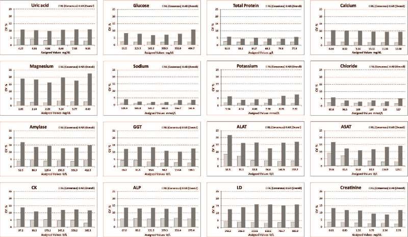 Figure 2.Interlaboratory variation (CV, %) anno 2014 in ∼ 200 Dutch medical laboratories and ∼ 75 Argentinian laboratories using six commutable, value-assigned EQA-samples ranked in ascending concentration or activity