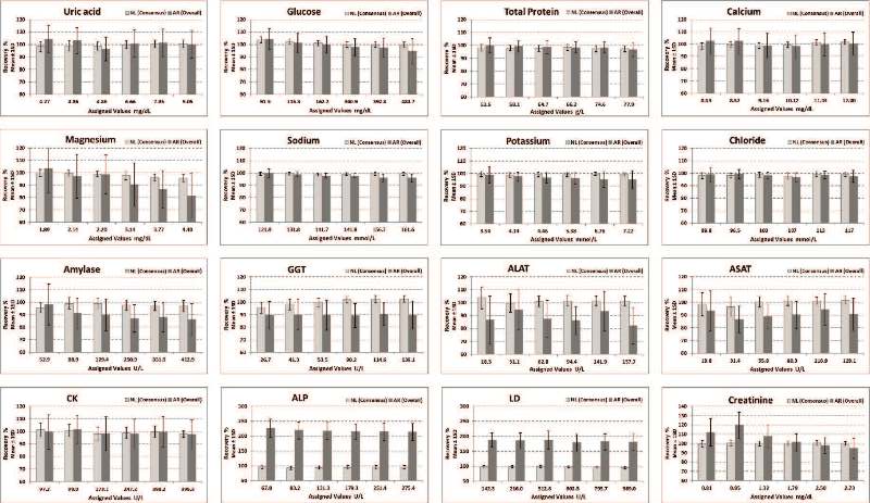 The EQA-organizations PEEC (Programa de Evaluación Externa de la Calidad en Argentina) and SKML (Stichting Kwaliteitsbewaking Medische Laboratoria in the Netherlands) agreed on a joint EQA-survey using commutable, value-assigned EQA-samples to document standardization status and metrological traceability in a sample of Argentinian labs for 16 general chemistry tests. Overall mean recovery was ~100% for substrates, electrolytes and CK in Argentinian labs, whereas for ALAT, ASAT, GGT and amylase there was significant underrecovery (Fig. 1). It cannot be excluded nor confirmed that preanalytical storage conditions confounded to some extent ALAT, ASAT, GGT and amylase test results as it is known by SKML that intermittent storage of EQA-samples at -70 °C is a necessity to keep enzyme activities stable. However, due to limited resources it was not feasible to arrange dry ice sending to the individual Argentinian labs. Overall Argentinian LD and ALP test results were not traceable to the IFCC Reference Measurement System, in contrast with the situation in the Netherlands.