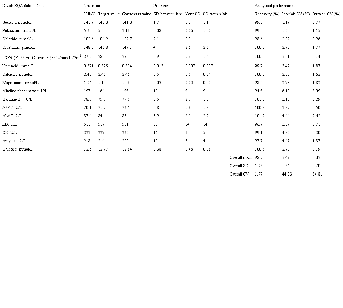 Table II. Recovery, intralab and interlab CVs (in %) of ~200 Dutch medical laboratories in the first quarter of 2014 using human, commutable and value-assigned EQA-samples from the Dutch EQA-organization (SKML) (3).