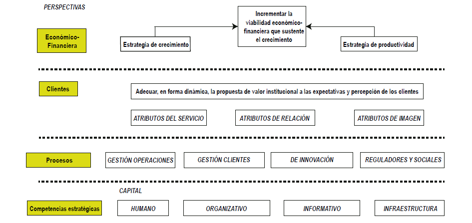 Con la información lograda del FODA, del PEST y las medidas de satisfacción, se realizó el mapa estratégico de la organización (Fig. 2) de acuerdo a las cuatro perspectivas del cuadro de mando integral: económicofinanciera, de los clientes, de los procesos y competencias estratégicas.