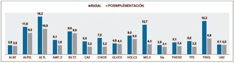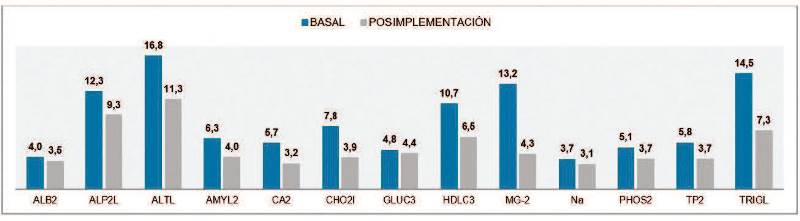 ALB2: albúmina, ALP2L: fosfatasa alcalina, ALTL: alaninaaminotransferasa, AMYL2: amilasa, CA2: calcio, CHO2I: colesterol, GLUC3: glucosa, HDLC3: colesterol HDL, MG-2: magnesio, Na: sodio, PHOS2: fósforo, TP2: proteínas totales, TRIGL: triglicéridos.