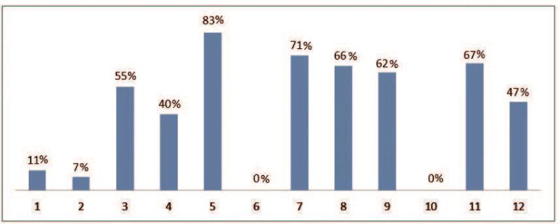 El laboratorio obtuvo una puntuación de 128 de un total de 275 puntos de la lista de verificación SLIPTA. Este puntaje correspondió a CERO ESTRELLA (0-150 puntos) cuando el porcentaje de avance del SGC era menor del 55%. Se evaluaron los puntos obtenidos considerando las diferentes secciones de la lista de verificación. La Figura 1 muestra el grado de cumplimiento en porcentaje por sección de la lista de verificación para el laboratorio. Se encontró un gran avance de desarrollo con porcentajes entre el 40 y el 83% para ocho secciones de la lista de verificación. Las secciones con el mayor grado de desarrollo correspondieron a equipamiento (83%) y compras e inventarios (71%). Se encontró un bajo porcentaje de avance para la documentación y registros del laboratorio (11%) y para la sección gestión crítica (7%). Dos secciones mostraron ausencia de cumplimiento correspondiente a evaluación y auditorias, e identificación de no conformidades, acciones correctivas y preventivas, respectivamente.