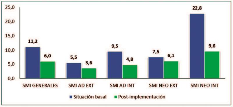 Figura 2: Comparación en porcentaje (%) del indicador SMI antes y después de la implementación. SMI: solicitud médica incorrecta, AD: adultas, EXT: externo, INT: internado, NEO: neonatología.