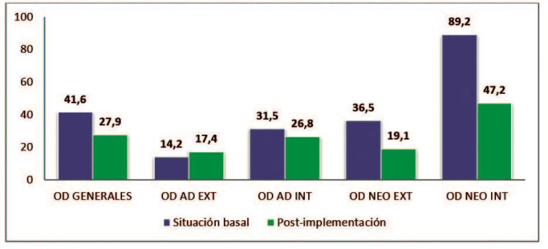 Figura 3: Comparación en porcentaje (%) del indicador OD antes y después de la implementación. OD: omisión del diagnóstico, AD: adultas, EXT: externo, INT: internado, NEO: neonatología.