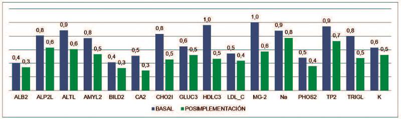El indicador incertidumbre se determinó para 46 analitos de Química Clínica en los dos niveles de concentración. Se obtuvieron diferencias significativas (p=0,0035) cuando se compararon los valores medios de este IC en situación basal y posimplementación. El 61% de los analitos disminuyó el valor de incertidumbre, y mejoró de esta manera el desempeño de los métodos analíticos. Se muestra en la Figura 8 y en la Figura 9 el valor de este indicador en aquellos analitos que mejoraron el desempeño, control normal y patológico respectivamente.