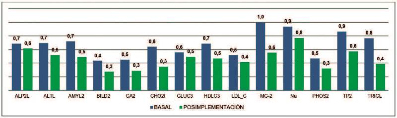 Los valores medios antes y después de la intervención de los IC analíticos fueron comparados mediante el test no paramétrico de Wilcoxon. Se encontraron diferencias significativas entre ambos grupos para todos los IC analíticos: índice de error total (IET), sigma e incertidumbre. El indicador IET se estimó en 52 analitos de Química Clínica en dos niveles de concentración (muestra control comercial normal y muestra control comercial patológica). Cuando se compararon los valores medios de este IC en situación basal y luego de la implementación se obtuvieron diferencias significativas (p=0,0019) entre ambos grupos. El 58% de los analitos disminuyó el IET luego de la intervención. Se muestran en la Figura 4 y la Figura 5 el valor de este indicador en aquellos analitos que mejoraron el desempeño, control normal y patológico respectivamente. Un IET menor a uno, y cercano a cero garantiza la calidad de los resultados analíticos.