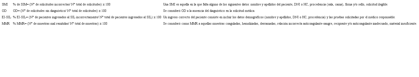 Para el indicador SMI fueron halladas diferencias significativas para el servicio de Adultas tanto por consultorio externo como por internación y para el servicio de Neonatología en internación. No se encontraron diferencias significativas para el servicio de Neonatología por consultorio externo. Para el indicador OD se encontraron diferencias significativas para el servicio de Adultas y el servicio de Neonatología, tanto en consultorio externo como en internación. El indicador MMR se clasificó en función del tipo de error en seis subindicadores.Se encontraron diferencias significativas en muestras coaguladas y muestras con material insuficiente.