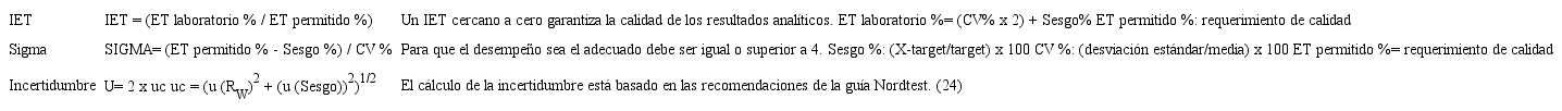 IET: índice de error total, U: incertidumbre expandida, uc: incertidumbre estándar combinada, S: desviación estándar, X: media RMS sesgo= media cuadrática del interlaboratorio, u (Cref): Incertidumbre del valor nominal del interlaboratorio.