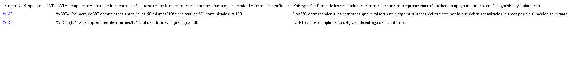 TAT: del inglés, turn around time, %VC: porcentaje de valores críticos, %RI: porcentaje de reimpresión de informes.