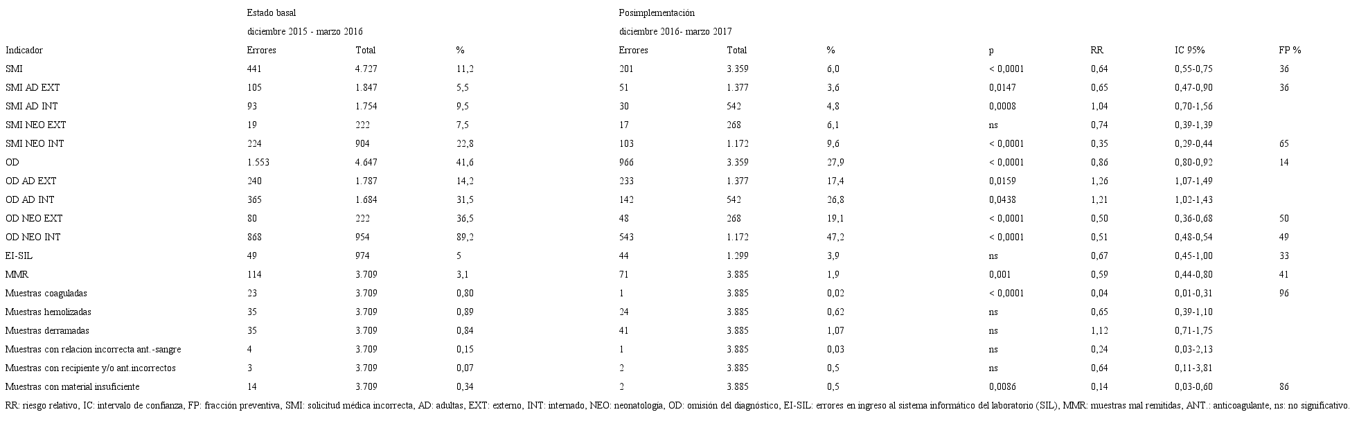 Se calculó el riesgo relativo (RR) como medida de asociación y la fracción preventiva (FP) como medida de impacto siempre que el RR fue menor de 1. La FP% indicó el grado de reducción del riesgo. Para que la disminución del riesgo fuera considerada verdadera el límite superior del intervalo de confianza (IC 95%) no superó el valor 1. Se observó disminución del riesgo (RR=0,64) y una fracción preventiva del 35% para el indicador SMI. Cuando fue clasificado en procedencia y origen, se encontraron RR<1 y altos porcentajes de FP para el servicio de Adultas por consultorio externo y para el servicio de Neonatología en internación. Para el indicador OD el RR fue de 0,86 y la FP del 14%. Cuando fue clasificado en procedencia y origen, solo se encontraron RR<1 y altos porcentajes de FP para el servicio de Neonatología en internación y consultorio externo. El RR fue de 0,67 y la FP del 33% para el indicador EI-SIL. Se encontró para el indicador MMR disminución del riesgo (RR=0,59) y una fracción preventiva del 41%. Cuando fue clasificado en función del tipo de error, se encontraron RR<1 y altos porcentajes de FP para muestras coaguladas y muestras con material insuficiente.