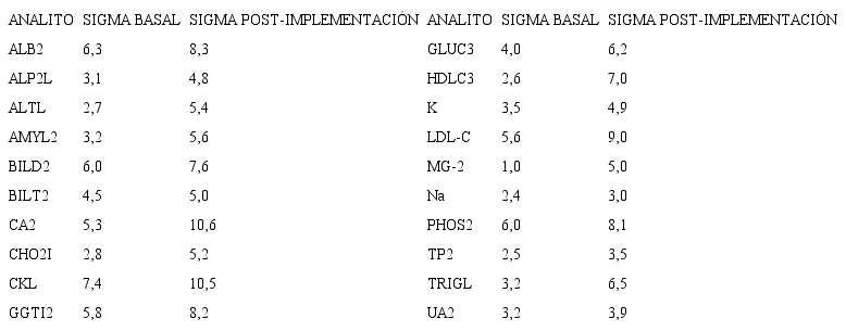 El indicador sigma también fue determinado para los 52 analitos de química clínica en los dos niveles de concentración (muestra control comercial normal y muestra control comercial patológica). Se obtuvieron diferencias significativas (p<0,0001) cuando se compararon los valores medios de este IC en situación basal y posimplementación. El 80% de los analitos aumentó el valor de sigma y, por lo tanto, mejoró el desempeño analítico luego de la intervención. Sigma considera el valor de imprecisión y sesgo obtenidos de la evaluación de métodos y, el requerimiento de calidad (error total permitido). El desempeño analítico de un método clínico se consideró inaceptable cuando sigma fue menor de 2, regular entre 2 y 4, bueno entre 4 y 6, y excelente cuando sigma fue igual o mayor de 6. Se muestran en la Tabla V los valores de sigma en situación basal y luego de la implementación para aquellos analitos que mejoraron el desempeño.