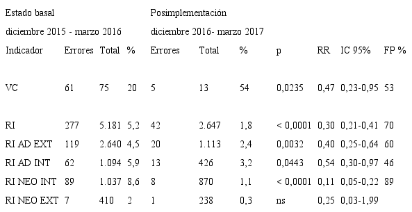 Para los IC posanalíticos VC y RI se estableció la frecuencia de cada uno de ellos en situación basal y luego de la implementación, y se calculó el valor de Chi cuadrado (X2) para establecer si existían diferencias entre ambos grupos. En la Tabla VI se muestran los resultados de la comparación de los indicadores VC y RI, antes y después de la implementación. Se encontraron diferencias significativas (p<0,05) para ambos indicadores. El valor de VC aumentó del 20% al 54% después de la implementación de la gestión documental, mientras que el indicador RI disminuyó de 5,2% a 1,8% luego de dicha intervención. Se observó disminución del riesgo (RR=0,47) y FP del 53% para el indicador VC, y para el indicador RI el RR fue de 0,30 y la FP del 70%.