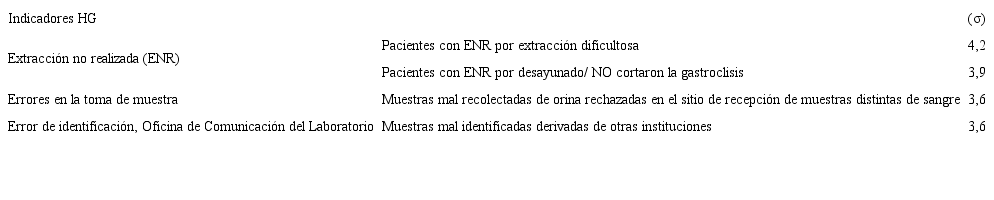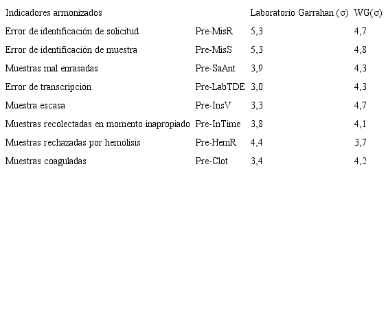 Como ejemplo se presenta un panel de indicadores de calidad expresados con la métrica sigma con el fin de demostrar su utilidad. Se incluyeron indicadores armonizados con los propuestos por Working Group “Laboratory Errors and Patient Safety” of International Federation of Clinical Chemistry and Laboratory Medicine (IFCC), con el objetivo de comparar el desempeño de los procesos del laboratorio con otros que participan en dicho proyecto internacional. Se sumaron indicadores propios para completar la información acerca del desempeño de procesos específicos del laboratorio (18).