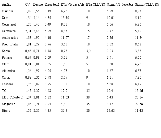 Se compara el ET con el ETa, de acuerdo a especificaciones de CLIA 88 y VB nivel deseable. Se considera desempeño aceptable cuando el ET medido es menor o igual que el ETa, y el valor sigma (σ) es mayor o igual a 3. Se estratifican los métodos en inaceptables (σ menores de 2), marginales (σ entre 2 y 3), pobres (σ entre 3 y 4), buenos (σ entre 4 y 5), muy buenos (σ entre 5 y 6) y el estándar de oro (σ mayor de 6). Puede verse que conforme al requisito de calidad seleccionado el desempeño para algunos analitos muestra mucha disimilitud. Los analitos con alta regulación homeostática (baja variabilidad biológica intraindividual) como el sodio, cloro, calcio, albúmina, proteínas totales, creatinina, magnesio no llegan a alcanzar las especificaciones biológicas a nivel deseable, por lo que deben ser monitoreados por especificaciones de calidad más permisivas como CLIA o variabilidad biológica mínima y para analitos como hierro y triglicéridos (con alta VB) se plantea la reasignación de ETa a metas de calidad más exigentes como por ejemplo la VB óptima. En el caso particular de magnesio y proteínas totales se evaluó el desempeño Sigma según la VB mínima ya que los valores obtenidos con CLIA 88 arrojan resultados mayores de 6 sigmas (Tabla V).