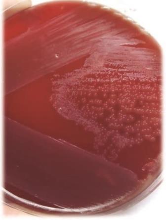 La cepa 1 originalmente no presentaba hemólisis en agar sangre ovina. Para poder observar la beta-hemólisis en sangre humana, característica de la intermedilisina (9), se preparó una placa con una base inferior de agar Columbia y una capa superior de 3 mL de agar Columbia con el agregado de 0,5 mL de sangre humana. Se estrió la placa con la cepa en estudio y se incubó durante 48 h a 35 ºC en atmósfera con 5% de CO. (Fig.1).