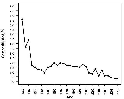 Figura 1. Evolución de la seropositividad en dadores de sangre. Período 1980-2010 (9).