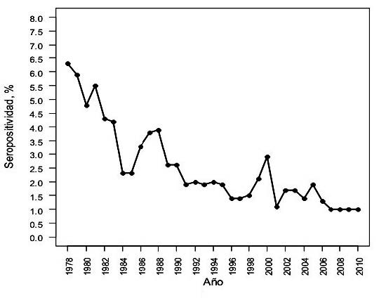 Durante el período 1980–2010 se produjo un descenso de la seropositividad en dadores de sangre de más de 6 puntos porcentuales (de 6,6% en 1978 al 0,3% en 2010) (9) (Fig. 1).