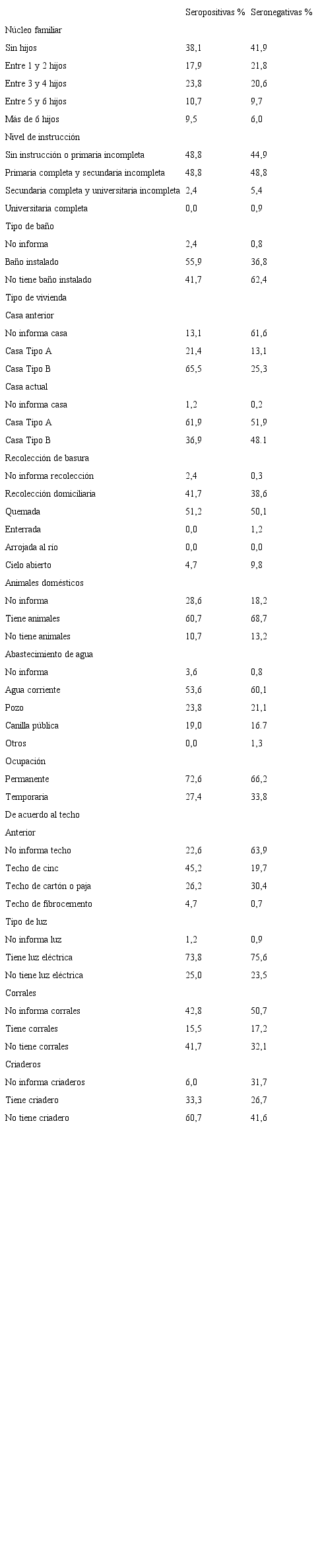 En las tareas de campo realizadas se encuestaron diversas variables, tanto en el domicilio como en el peridomicilio y principalmente en galpones de cría de pollos, donde estaban insertos los pacientes seropositivos y los seronegativos, mediante una serie de indicadores que se detallan y presentan comparativamente, en una planilla epidemiológica.