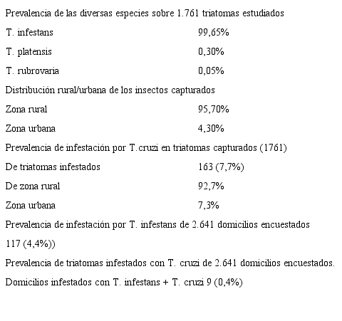 Los estudios sobre los triatominos de la región que se presentan seguidamente corresponden a las confirmaciones de dichos vectores sobre el total de las denuncias de su presencia realizadas espontáneamente por la población (Tabla III).
