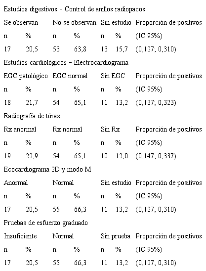 Los estudios cardiológicos realizados a los pacientes con serología positiva para enfermedad de Chagas, mostraron principalmente alteraciones en la conducción, dadas por bloqueo de rama derecha, seguidos de diferencias menores en otros aspectos de la conducción. En los pacientes chagásicos crónicos estudiados, las alteraciones cardíacas se presentaron en menos del 10% de los casos, cifras menores que las informadas en otras publicaciones.