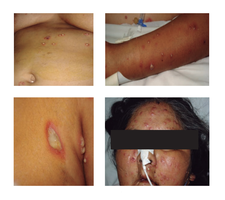 Paciente de 63 años de edad, inmunodeprimida que presentó múltiples granulomas cutáneos (Fig. 1) de los que se obtuvo material por biopsia que se sembró en caldo infusión cerebro corazón (Fig. 2), agar chocolate (Fig. 3) y se realizaron coloraciones de Gram (Fig. 4) y Kinyoun (Fig. 5). La bacteria, que también se aisló de hemocultivos, se identificó como Nocardia brasiliensis por pruebas bioquímicas convencionales y por espectrometría de masa (MALDI-TOF MS, Bruker, BD).