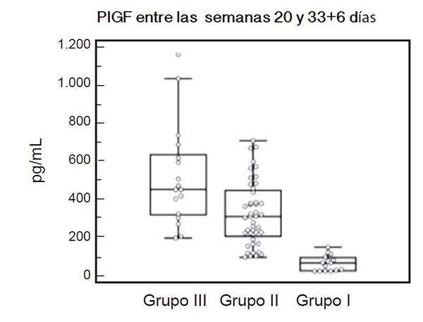 Para el caso del PlGF antes de la semana 33+6 días y después de la semana 34 la comparación entre las embarazadas del Grupo III y las embarazadas del Grupo I y las del Grupo II con las embarazadas del Grupo I, las diferencias fueron estadísticamente significativas p<0,001. La diferencia entre las embarazadas del Grupo I y las embarazadas del Grupo II tanto antes de la semana 33+6 días como después de la semana 34, no fue significativa, p<0,05 (Fig.1) (Fig. 2).