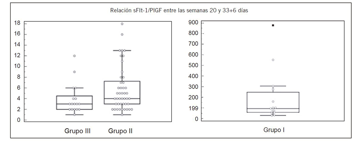La mediana de la relación sFlt-1/PlGF del Grupo II, cuyas muestras fueron tomadas después de la semana 34 fue de 10, la mediana del sFlt-1 fue de 2.424 pg/mL y el de PlGF fue de 235,1 pg/mL, mientras que la mediana del peso de los recién nacidos fue de 3.185 g. Para las embarazadas cuyas muestras fueron tomadas antes de la semana 33+6 días la mediana de la relación sFlt-1/PlGF, sFlt-1, PlGF y el peso del recién nacido fueron de 4,3, 1.336,5 pg/mL, 362,8 pg/mL y 3.155 g, respectivamente. Para el Grupo III, donde las muestras fueron tomadas antes de la semana 34 los valores de relación sFlt-1/PlGF, sFlt-1, PlGF y el peso del recién nacido fueron 3,5, 1.752,7 pg/mL, 446,1 pg/mL y 3.340 g, respectivamente y para las embarazadas donde la muestra fue tomada después de la semana 34 los valores fueron de 6, 1.884 pg/ mL, 367,3 pg/mL y 3.630 g, respectivamente (Tabla II).