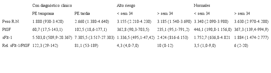 Tabla II. Comparación del peso del recién nacido, factor de crecimiento placentario (PlGF), receptor de la tirosin-quinasa tipo 1 en su forma soluble (sFlt-1) y su relación entre los distintos grupos de embarazadas.