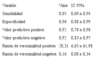 Los resultados fueron VPP 91,67%, VPN 92%, S 84,6%, E 95,8%, LR+ 20,3 y LR- 0,16 como lo muestra la Tabla III.