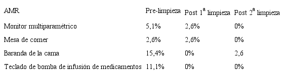 En los controles, luego de la primera limpieza, los aislamientos correspondientes a AMR se detectaron en 1 de 39 muestras en el monitor multiparamétrico (2,6%), en 1 de 39 muestras en la mesa de comer (2,6%) y no se obtuvo desarrollo en los hisopados de la baranda de la cama ni en el teclado de la bomba de infusión para medicamentos.