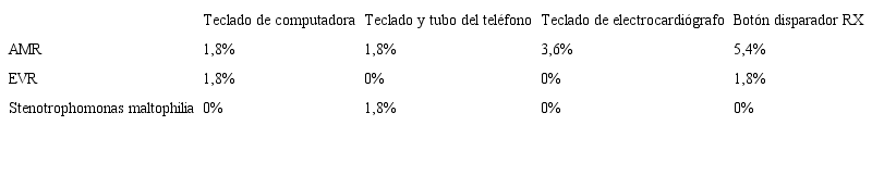 Dentro de los microorganismos aislados, AMR se detectó en 3 de 55 muestras de botón disparador de rayos X (5,4%), en 2 de 55 muestras en el teclado del electrocardiógrafo (3,6%), un aislamiento en el teclado de la computadora portátil (1,8%) y un aislamiento en el teclado y tubo del teléfono (1,8%). EVR se aisló en una de 55 muestras en el botón disparador de rayos X (1,8%), al igual que en el teclado de la computadora portátil. Stenotrophomonas maltophilia se aisló en una de 55 muestras del teclado y del tubo del teléfono (1,8%) (Tabla II).