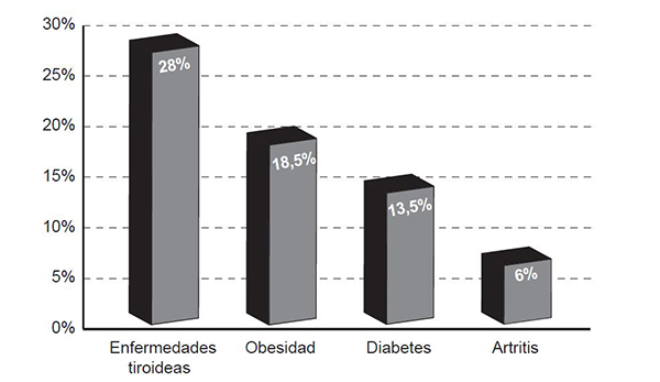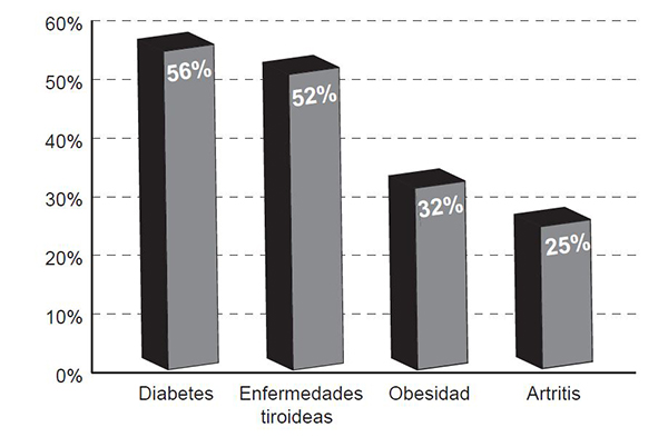 – Entre los familiares directos de los pacientes se encontró diabetes en el 56% de los casos, enfermedades en la glándula tiroidea en el 52%, obesidad en el 32% y artritis en el 25%.
