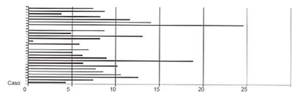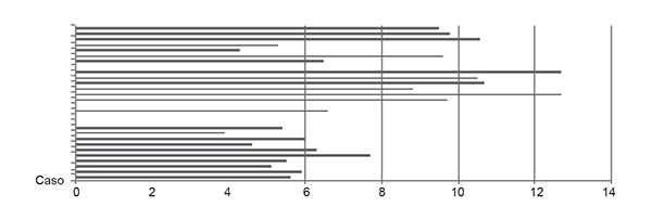 – Ninguno de los pacientes tuvo valores de homocisteína superiores a lo normal y solo dos de ellos tuvieron valores por debajo del rango normal. El promedio muestral fue 7,64 μmol/L y la mediana 6,55 μmol/L para un intervalo de referencia entre 5 y 15 mmol/L (Fig. 3).