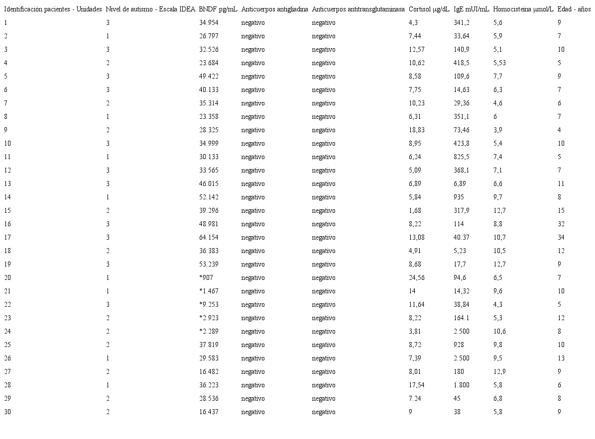 * Valores de BNDF obtenidos a partir de plasmas. Todos los demás se procesaron a partir de sueros. Esto fue así porque las extracciones fueron dificultosas y no alcanzó la muestra para procesarlas del suero. No se consideró conveniente repetir la extracción porque resultan muy traumáticas en pacientes con estas patologías. BNDF: factor neurotrófico derivado del cerebro. IDEA: inventario del espectro autista.
