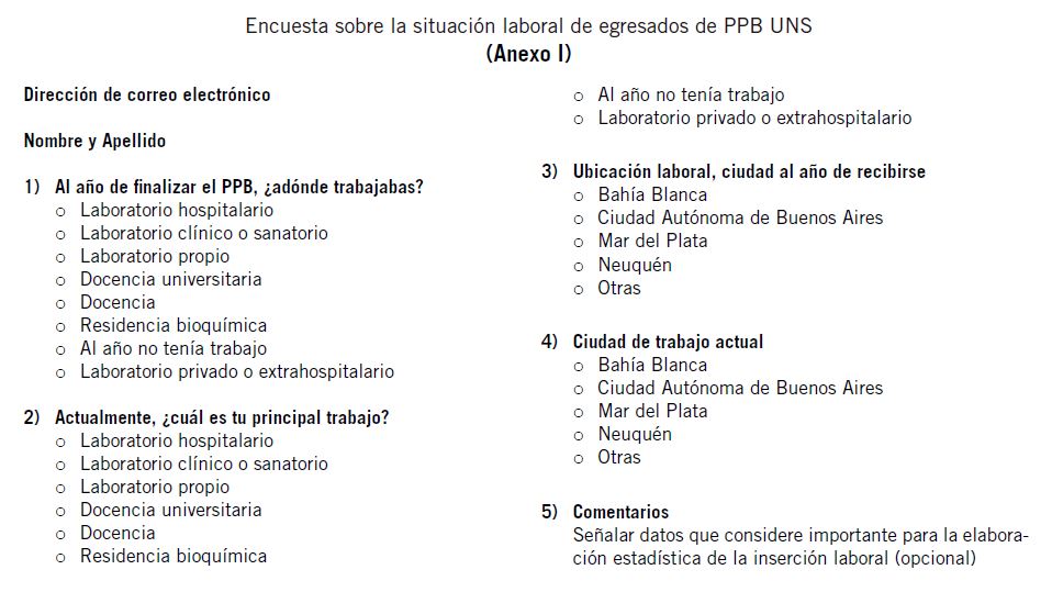 Dada las recomendaciones de la Comisión Nacional de Evaluación y Acreditación Universitaria (CONEAU) en lo referente a reforzar los mecanismos internos de seguimiento y evaluación de la carrera de Bioquímica, en la Universidad Nacional del Sur (9)(11) el Practicanato Profesional de Bioquímica ha implementado un mecanismo de seguimiento de la trayectoria de los graduados que permite conocer la inserción laboral y las actividades que desarrollaban al año de finalizar las prácticas y en la actualidad. Esto ha posibilitado también que los graduados que no desarrollan sus actividades en la propia universidad constituyan un nexo importante en las relaciones interinstitucionales que establece el posgrado.