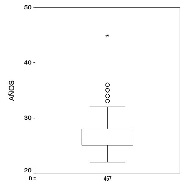 Se inscribieron en la asignatura 457 estudiantes distribuidos en 21 promociones sucesivas de 22 alumnos en promedio. El rango de edades estuvo comprendido entre 25 y 45 años con una media de 26,7 años y una mediana de 26 años (Fig. 1). Existió una diferencia significativa entre las distintas promociones (test de Kruskal-Wallis p<0,0001). La distribución por sexo fue de 371 mujeres (81%) y 86 varones (19%).