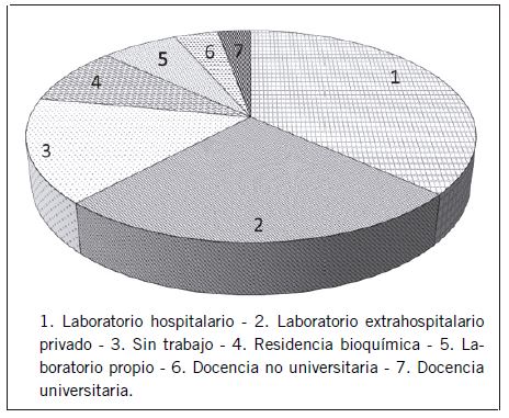 La inserción laboral de los graduados se distribuyó tanto en el sector público como en el privado. Clínicas, sanatorios y hospitales absorbieron la mayoría del mercado de trabajo de los noveles graduados. El ejercicio profesional en relación de dependencia resulta ser la segunda opción en laboratorios privados extrahospitalarios. Aproximadamente un 15% de los egresados no logró insertarse laboralmente. La residencia bioquímica ocupó un cuarto lugar, indudablemente por la gran preparación académica asociada y el impacto trascendente que la misma le proporciona al graduado. Se observó un aumento de los noveles profesionales que lograron instalar su propio laboratorio desde sólo 1 al año de finalizar, hasta 14 profesionales actualmente. La docencia en general mantiene un porcentaje del 6,5%, con una leve tendencia actual a la docencia no universitaria.