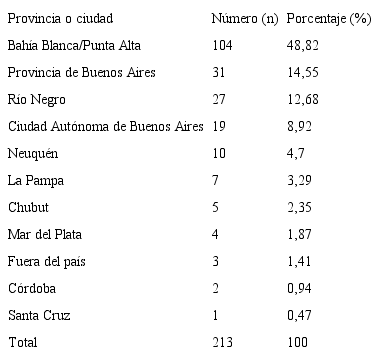 Al año de finalizar las prácticas el 46,5% residía en Bahía Blanca mientras que actualmente el 40,8% permanece en la ciudad. El segundo lugar de residencia de los egresados correspondió a otras ciudades del interior de la provincia de Buenos Aires, seguidas por la Ciudad Autónoma de Buenos Aires tanto al año como actualmente. El resto de los egresados optaron por lugares laborales del sur de la Argentina, con predilección por la provincia de Río Negro, al año de recibidos.