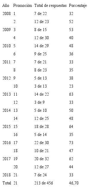 Tabla II. Detalle de las respuestas recibidas según el año de promoción.