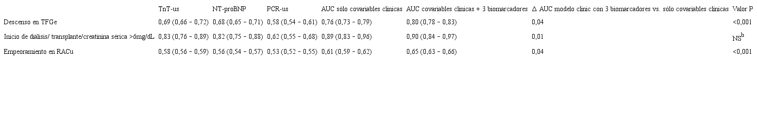 El rendimiento diagnóstico fue evaluado mediante una curva ROC que demostró un rendimiento de moderado a bueno de TnT-us y NT-proBNP para un deterioro ≥40% de la TFGe al fin de tratamiento [área bajo la curva (AUC): TnT-us, 0,69 (0,66–0,72); NT-proBNP, 0,68 (0,65-0,71); PCR-us, 0,58 (0,54-0,61)], y un muy buen rendimiento para el outcome compuesto que incluyó diálisis, trasplante renal o creatinina sérica >6,0 mg/dL [AUC: TnT-us, 0,83 (0,77-0,90); NT-proBNP, 0,82 (0,76-0,88); PCR-us, 0,62 (0,55–0,68)], mientras que PCR-us demostró tener poca eficacia diagnóstica para estos outcomes clínicos (Tabla 1).