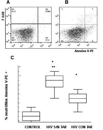 Translocación de la fosfatidilserina mediante marcación con anexina V-PE y 7-AAD en (A) un control sin infección y (B) en un paciente HIV seropositivo asintomático sin TAR. (C) Porcentaje de apoptosis de neutrófilos de pacientes HIV seropositivos y controles no infectados: las cajas representan la mediana y los rangos intercuartilos y las barras de error, los valores mínimo y máximo * p<0,0001 respecto a controles sanos; ** p<0,05 respecto a pacientes HIV con TAR. Valores de . obtenidos con la prueba no paramétrica de Kruskal-Wallis (test de comparación múltiple de Dunn).