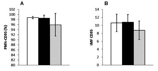 Con respecto a la expresión de CD95, en pacientes HIV sin TAR, el porcentaje de neutrófilos que expresaron este antígeno (media±DE=98,60%±1,10) y la cantidad de moléculas (IMF±DE=10,60±2,20) fueron similares a los de los controles sin infección (media± DE=98,80%±0,4; IMF±DE=10,80±1,90) y superiores a los niveles expresados en pacientes HIV con TAR (media±DE=95,90%±4,50; IMF±DE=8,70±2,30), pero en ningún caso las diferencias fueron estadísticamente significativas (Fig. 5).