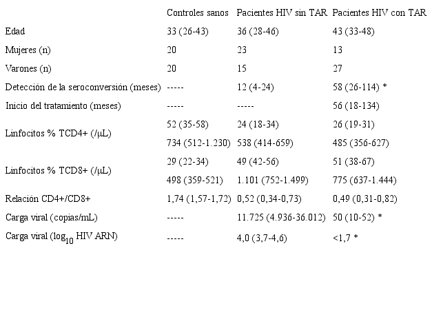 El grupo control positivo estuvo constituido por 40 pacientes con infección asintomática por el HIV (13 mujeres y 27 varones, edad: 28 a 58 años) y con TAR consistente en la administración de dos inhibidores de la transcriptasa inversa análogos de nucleósidos asociados a un inhibidor de la integrasa o un inhibidor de la transcriptasa inversa no nucleósido o un inhibidor de la proteasa potenciado. El período medio del TAR fue de 56 meses (1 a 156 meses) y todos los pacientes tenían una carga viral indetectable.