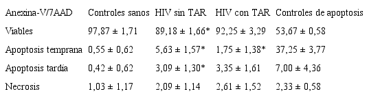 Tabla II. Nivel de apoptosis de neutrófilos de pacientes HIV seropositivos sin TAR y controles en las distintas etapas del proceso de muerte.