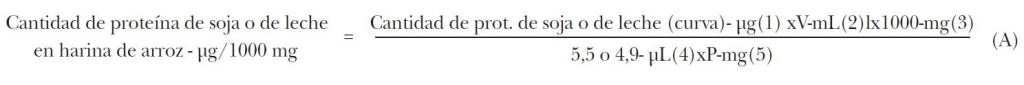 La cantidad de proteína de soja o de leche en μg/1000 mg de harina de arroz se calculó según la siguiente fórmula: