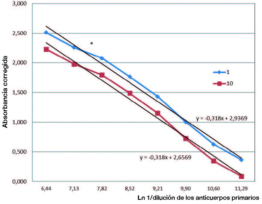 La concentración de antígeno seleccionada fue de 1 μg de proteínas de leche /100 μL de buffer carbonato/bicarbonato, pH 9,6. La dilución de anticuerpos primarios seleccionados para utilizar en la competencia fue de 1/50000 (ln 1/dilución de anticuerpos primarios: 10,82).