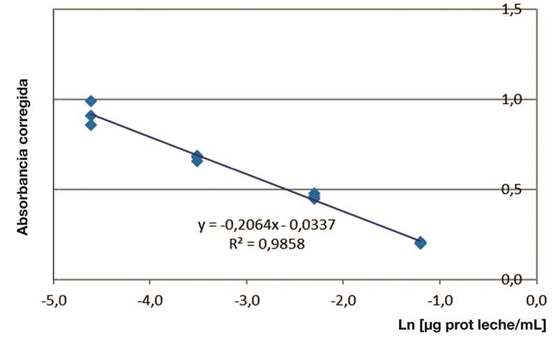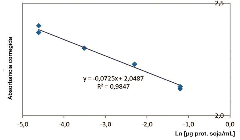 A continuación, se construyó una curva de calibración de absorbancia corregida versus ln concentración de soja o leche (μg de proteínas de soja o de leche/mL).