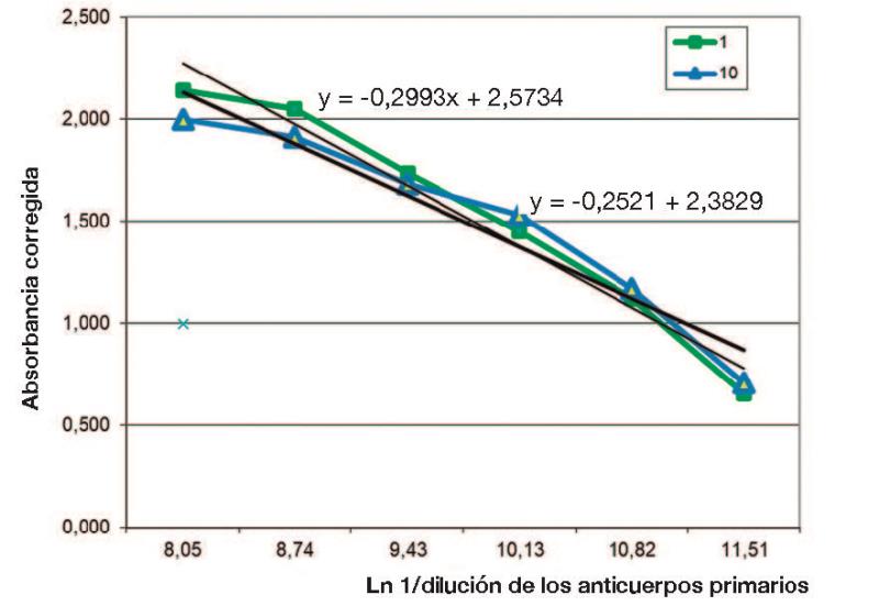 Se sembraron en la placa 100 μL por pocillo de dos concentraciones diferentes de antígeno: una concentración de 1 μg y otra de 10 μg de antígeno/100 μL de buffer carbonato/bicarbonato, pH 9,6 (buffer carbonato de sodio 0,015 M, bicarbonato de sodio 0,035 M). Luego se incubó en cámara húmeda, en oscuridad a 4 °C durante 24 h. Se lavó la placa 5 veces con solución de lavado (NaCl al 0,9% p/v y Tween 20 al 0,0125% v/v en agua). Se sembraron 200 μL de solución de bloqueo (gelatina bovina al 1% p/v y Tween 20 al 0,1% v/v en TBS) en cada pocillo. Se incubó una hora en cámara húmeda, en oscuridad a 37 °C, con agitación. Se lavó la placa 5 veces con solución de lavado. Posteriormente se sembraron 100 μL de diferentes diluciones del anticuerpo primario diluido con buffer TBS con Tween 20 al 0,1% v/v y 3% de polietilenglicol. Se ensayaron diluciones de anticuerpos primarios entre 1/156 y 1/10000 en el enzimoinmunoensayo para la detección de soja y entre 1/12500 y 1/1600000 para la detección de leche. En los pocillos correspondientes al blanco (blanco 1 y blanco 10) se sembró solamente el buffer utilizado para la dilución de anticuerpos primarios. Se incubó una hora en cámara húmeda, en oscuridad a 37 °C con agitación. Se lavó la placa 5 veces con solución de lavado. Se sembraron 100 μL de anticuerpos secundarios, anti- IgG conjugados con fosfatasa alcalina de Bio-Rad (el mismo fue obtenido en cabras inmunizadas con IgG de conejo purificada) diluidos 1:3000 con buffer TBS con 0,1% v/v de Tween 20 y 3% de polietilenglicol. Se incubó una hora en cámara húmeda, en oscuridad a 37 °C con agitación. Se lavó la placa 5 veces con solución de lavado. Se sembraron 100 μL de solución de revelado (paranitrofenilfosfato 1 mg/mL en un buffer que contenía 10% v/v de dietanolamina y 0,01% de cloruro de magnesio, pH 9,8). Se incubó 20 minutos en cámara húmeda, en oscuridad a 37 °C con agitación. Se midió la absorbancia en un lector de placas de ELISA a 405 nm. Los valores de absorbancia fueron corregidos con la absorbancia promedio correspondiente al blanco. Se graficaron las curvas de absorbancia corregida versus ln 1/dilución de anticuerpos primarios utilizando una hoja de cálculo de Microsoft Excel 2010.